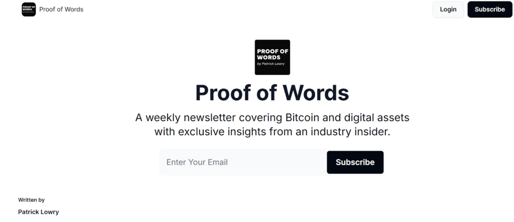 Proof of Words, published by industry insider Patrick Lowry of Samara Asset Group, delivers focused analysis on Bitcoin and digital assets. This newsletter provides a direct, often opinionated view that cuts out market noise to offer substantive insights.