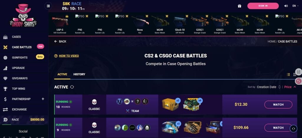 Onboarding is also relatively easy. The site has help posts and short videos that explain how battles work, which made our first run smooth. Case pages show what’s inside before you add them to a match, and the free daily cases are a low-risk way to warm up or test the feel. Prices run from small buys to higher stakes, so newcomers and regulars can both find a lane. If you want a familiar CS2-first layout with solid, predictable battles, DaddySkins is a reliable pick among case battle sites.
