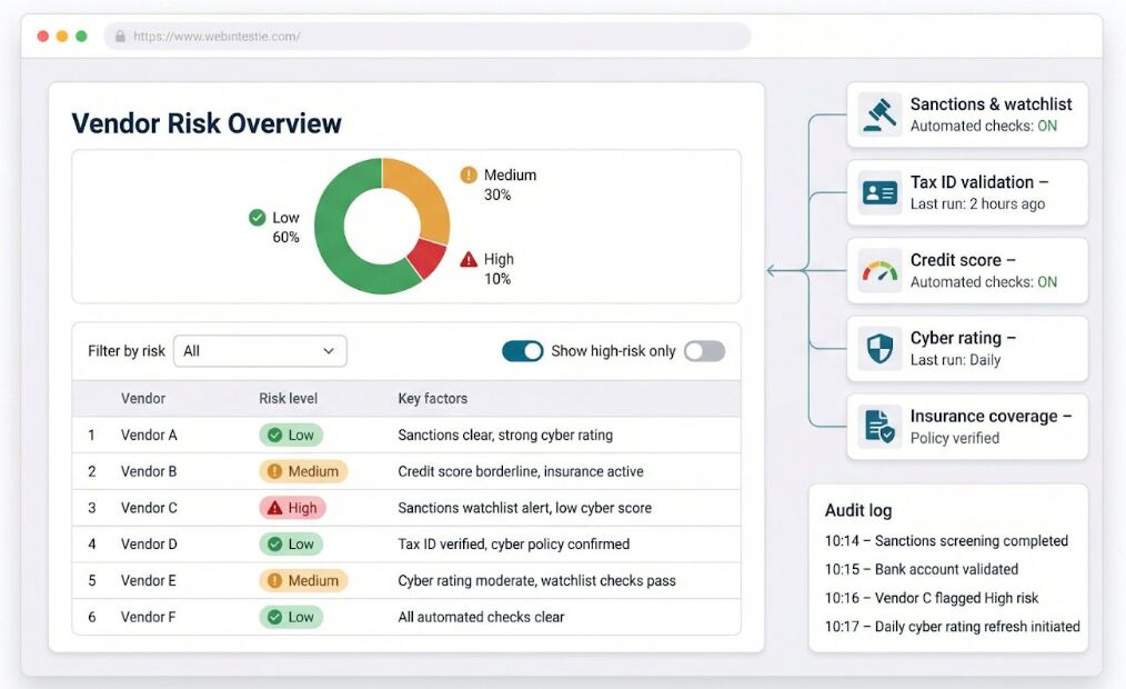 What risks does automated onboarding help control? An automated workflow enforces checks that are easy to skip in a manual process. Sanctions screening, bank account validation, cyber and financial risk scoring, and insurance and certification review all happen in a consistent way. High risk vendors are routed to deeper review, while low risk vendors follow a lighter but still compliant path.