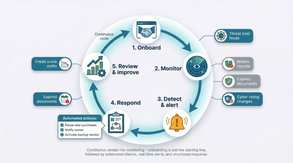 How does continuous monitoring fit into vendor onboarding? Onboarding is the starting point for a longer life cycle. The same platform that runs checks on day one can keep watching vendors for changes in breach exposure, expired documents, or downgraded security ratings. When a threshold is crossed, the system reopens the vendor record, alerts owners, and triggers predefined playbooks.