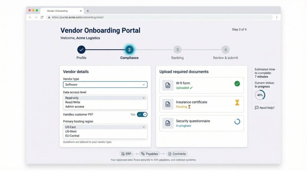 The moment a supplier opens the portal, an adaptive questionnaire sizes them up across data access, geography, and financial health. Answers trigger follow-ups: a SaaS vendor fields security questions, while a janitorial firm moves straight to insurance proof.