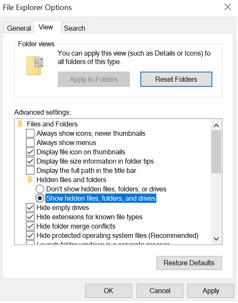 Step 3: Afterward, select “Show hidden files, folders, and drives.” Tap “Apply.” This is how to recover corrupted files from USB for free by revealing them.
