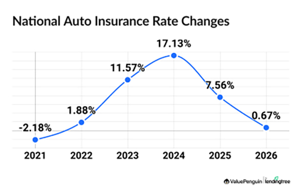 Recent insurance pricing trends also reflect this pressure. National auto insurance rates have increased sharply in recent years. For example, rate changes rose by about 11.57% in 2023 and peaked around 17.13% in 2024, before slowing to roughly 7.56% in 2025.