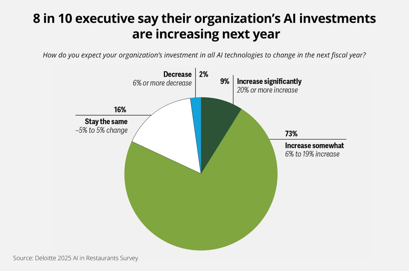 - Eight in 10 (82%) restaurant executives surveyed plan to increase investments in AI technologies in the next fiscal year, and hope to see benefits for improved customer experience (60%), restaurant operations (36%), and loyalty programs (31%).