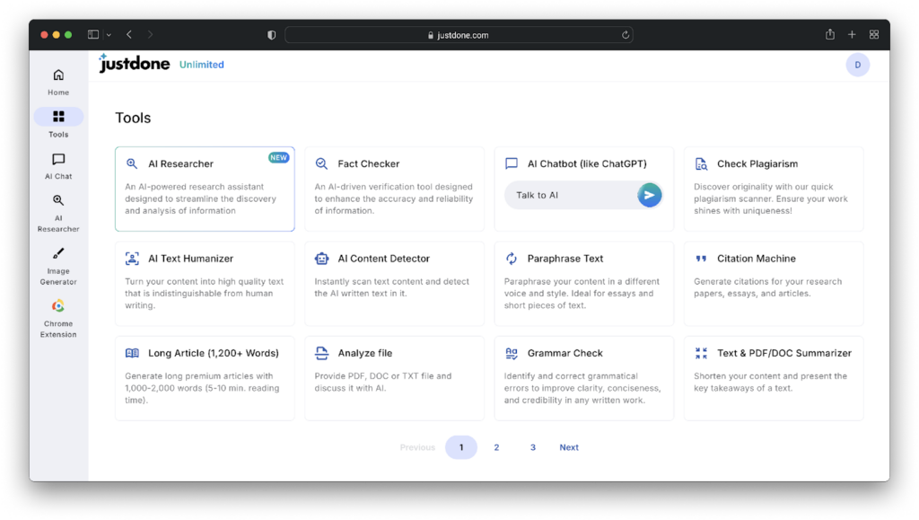 This idea is put into reality on the JustDone website. It gives you access to tools that can help you with every step of writing, from finding patterns made by AI to turning them into genuine language.
