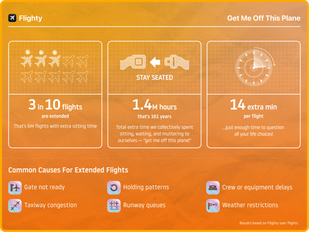 A new Flighty metric measures the gap between a flight’s scheduled arrival and when passengers actually got off the plane. This is the time typically stretched by runway congestion, taxiing, unavailable gates, holding patterns, and more. It captures all those extra minutes spent sitting, waiting, and muttering, “Get me off this plane!”
