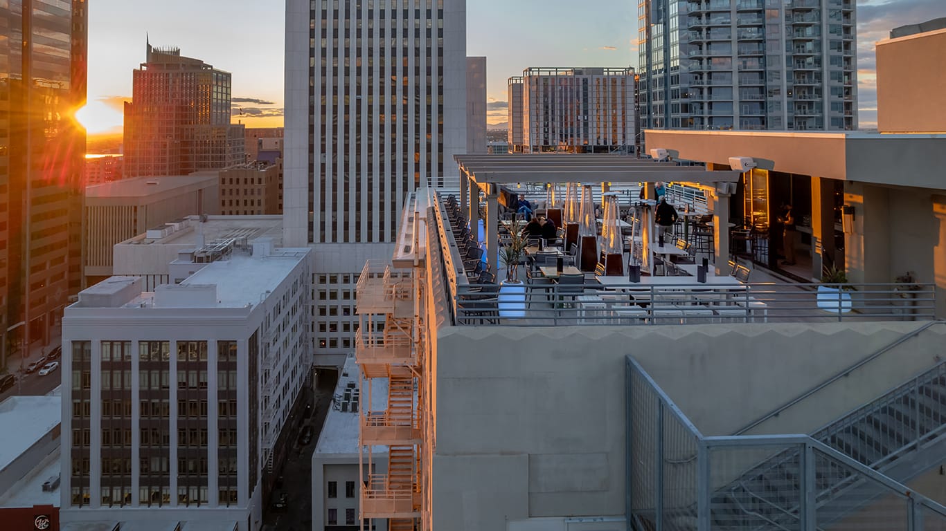 Lucero pairs elevated small plates and craft cocktails with sweeping sunset and city vistas, creating a refined rooftop social setting. The space evokes a starlit-night ambiance through thoughtful design and elevated service.