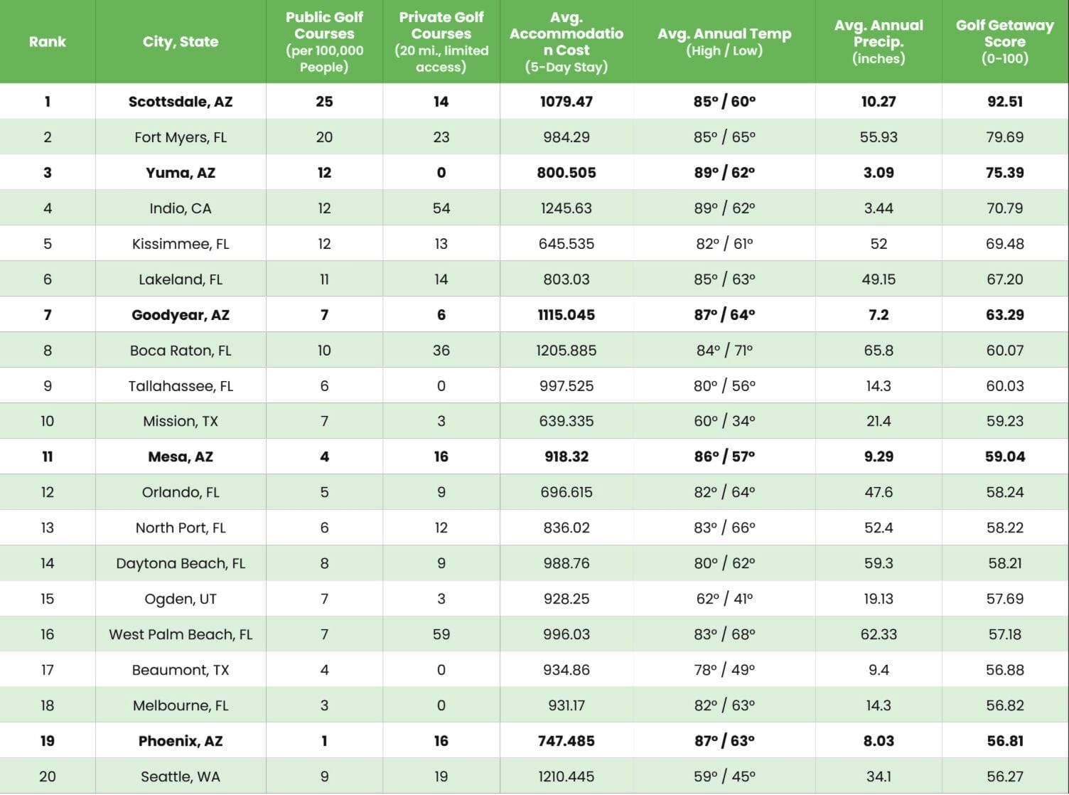 - Arizona’s Golf Depth: With Scottsdale (#1), Yuma (#3), Goodyear (#7), Mesa (#11), and Phoenix (#19), Arizona has more top golf destinations than any other state.