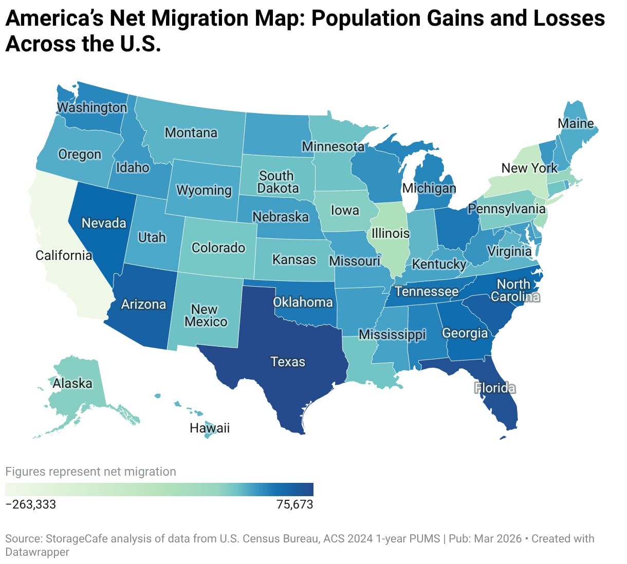 A new StorageCafe analysis of Census data shows the state ranked No. 4 nationally for net domestic migration in 2024, adding 51,000 more residents than it lost to other states. While inbound migration slowed, Arizona’s 10% decline was far more modest than in larger magnets like Texas (45%) and Florida (50%), pointing to continued demand despite shifting conditions nationwide.