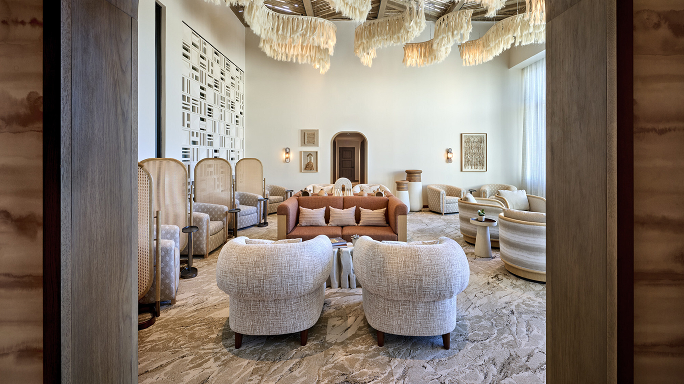 Throughout The Spa at Camelback Inn, custom furniture and lighting reinforce the connection to nature, including dramatic S-shaped chandeliers crafted from natural agave fiber. A bespoke music program and signature aromatics enhance the multisensory experience from the moment guests arrive. Outdoors, the pool area mirrors the spa’s natural aesthetic with bespoke furnishings and bioclimatic cabanas that automatically adapt to wind and moisture, ensuring comfort year-round. The redesigned outdoor experience also incorporates sculptural desert planting, expanded lounging areas, and thoughtfully oriented gathering spaces that frame panoramic views of Mummy and Camelback mountains, further strengthening the spa’s seamless connection to the surrounding landscape.