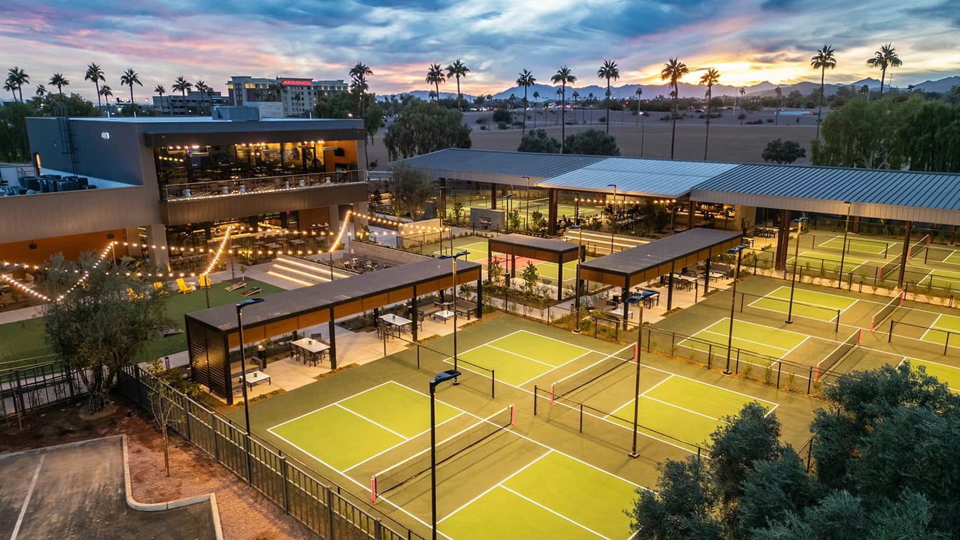 Electric Pickle is a large, entertainment-driven pickleball venue in Tempe featuring nine courts. Electric Pickle is different from other pickleball facilities, some of the courts open to play are enabled with AI to automatically keep track of the matches score. Additionally, the space combines pickleball with a full restaurant, bar, lounge, and additional activities like golf simulators and bocce. Designed as a social hub, it blends competitive play with dining and nightlife in a high-energy setting.