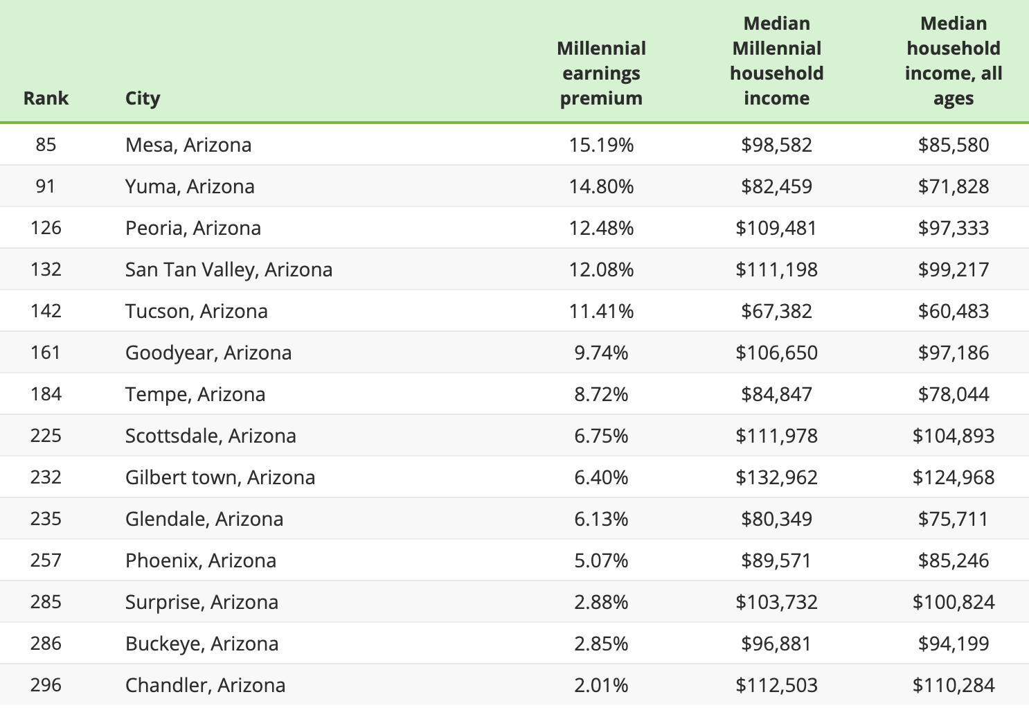 Cities are ranked based on the percentage difference in annual median income for Millennial households versus all local households. Here’s how Arizona cities ranked: