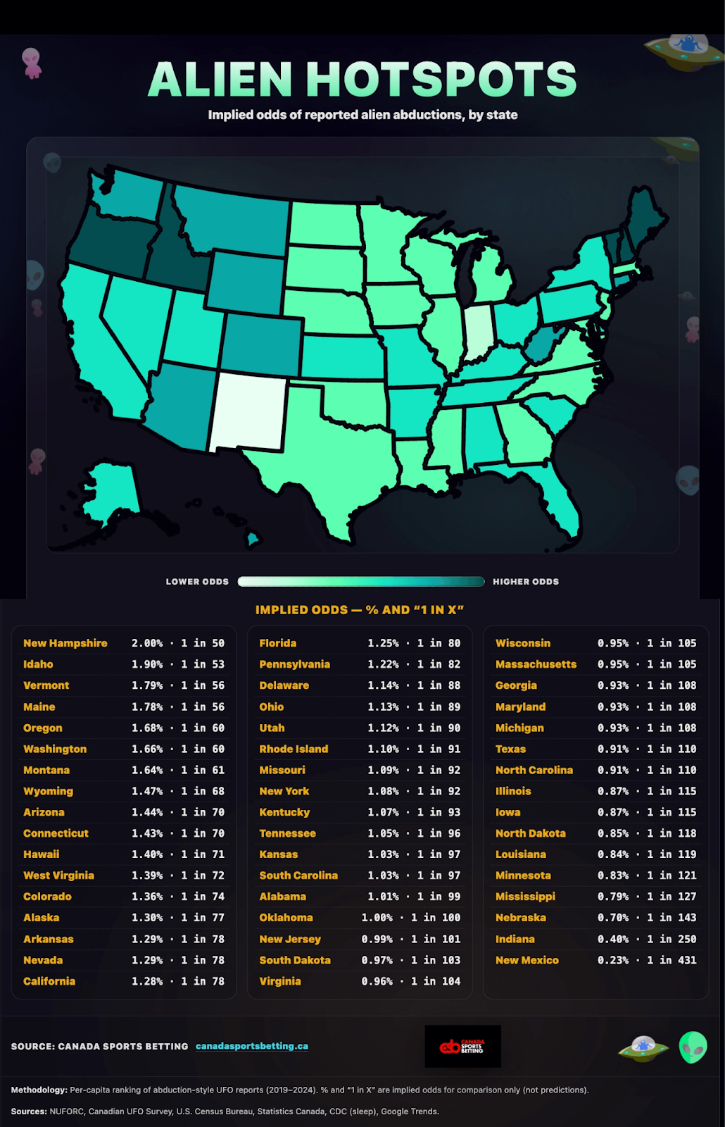 The ranking doesn’t claim aliens are real or that abductions are actually happening. Instead, it tracks where Americans are most likely to report experiences that sound like an abduction story — and turns that pattern into a simple, visual ranking.