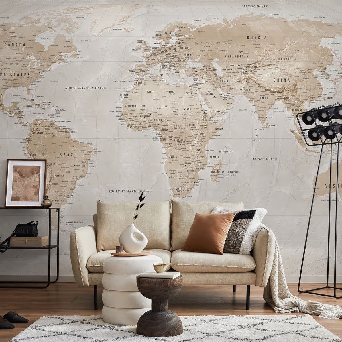 Neutral furniture helps the wall feel intentional. Light woods, warm whites, soft grays, and simple shapes keep the space balanced. If your furniture is dark, choose a map with a lighter background so the room does not feel heavy. Keep nearby patterns quieter and let the map carry the visual interest.