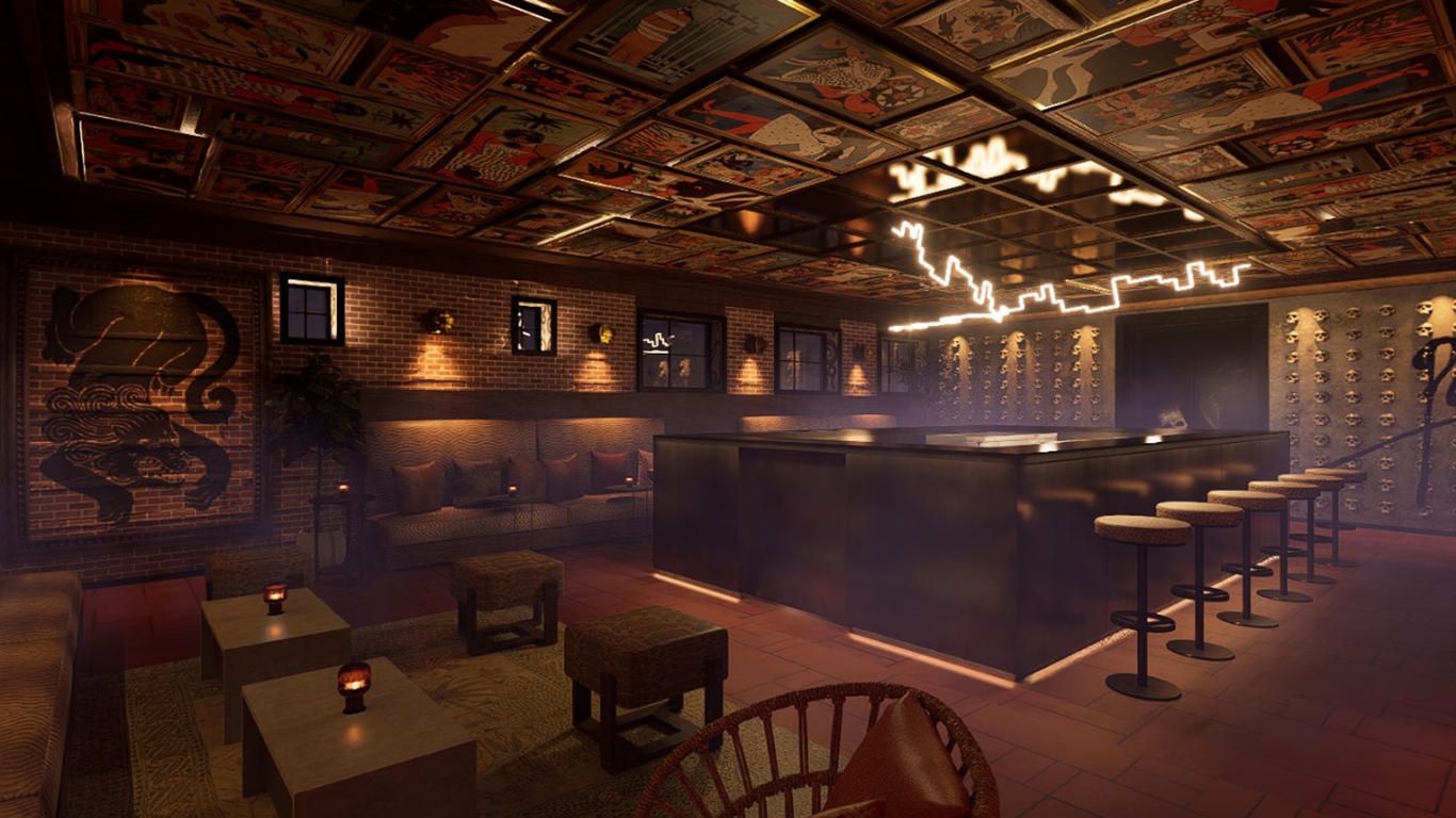 Other spaces offer contrasting moods. Pablo’s Living Room is the heart of Pablo’s House, pairing illustrated ceiling panels with a skull-lined wall to create a detail-rich setting. Anchored by a large central bar built for connection, it’s social, conversational and live; the place where strangers become friends and nights begin to unfold.
