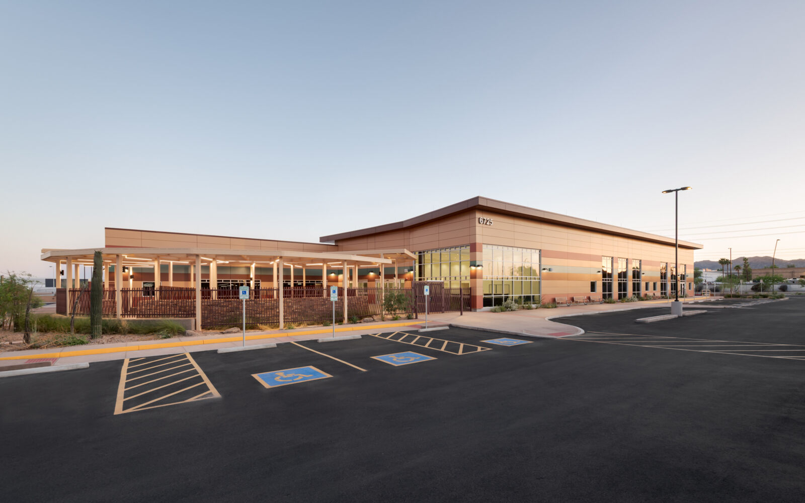 A partially shaded central courtyard with colored concrete and cast-in-place seating supports community gatherings and outdoor wellness activities. Interior design elements, such as floor-to-ceiling glazing, skylights, Solatubes, terrazzo flooring, and a custom hummingbird mosaic, enhance daylighting while celebrating Pascua Yaqui culture through integrated tribal artwork. Phase II added a 6,000-square-foot expansion to increase clinical and administrative capacity, along with covered parking and secured staff areas.