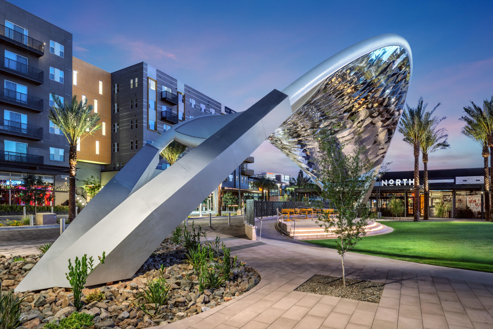 The shade canopy stands as the visual anchor, designed as Arizona’s reimagined version of Chicago’s Bean, a sculptural element functioning as a performance stage. Engineering and modeling took a full year to achieve construction-ready documents, resulting in a landmark structure defining the entire corridor. Three Fox Restaurant Concepts were delivered simultaneously: casual to-go venues and sleek sit-down establishments, each requiring complete shell and tenant improvement work including full kitchen installations, custom finishes, and coordinated MEP systems.