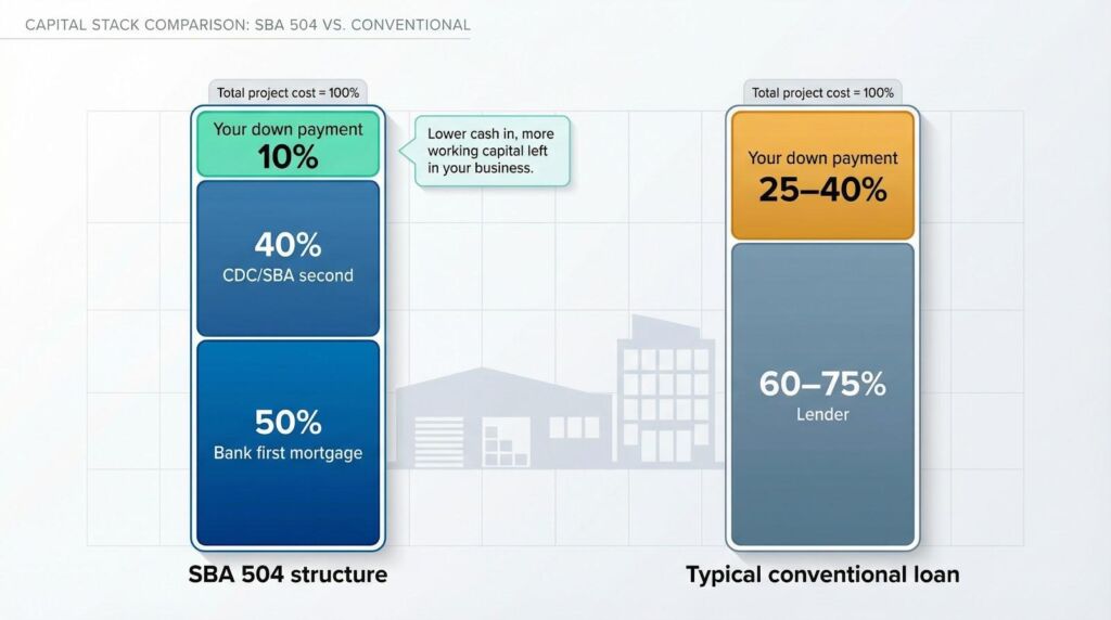 A standard 504 deal splits funding three ways: the bank covers 50 percent, a Certified Development Company backed by the SBA funds 40 percent, and you write a check for the remaining 10 percent, according to TMC Financing. Conventional lenders often ask for 25–40 percent, so this structure can cut your equity requirement in half.
