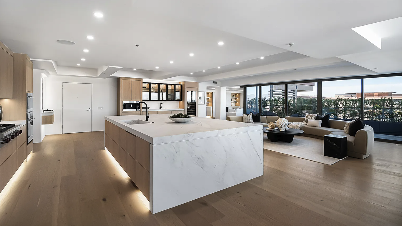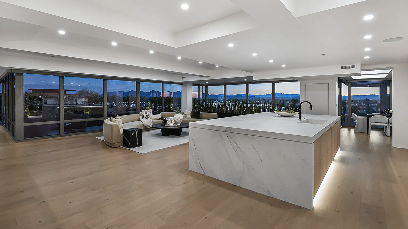 Listed by Compass’ Jason Glimcher for $6.5 million and located at 7157 E Rancho Vista Drive, Unit 7006 in Optima Camelview Village, the four-bedroom, five-bathroom corner penthouse spans 5,119 square feet, making it the largest condo in Old Town Scottsdale. Fresh off a recently completed, massive, floor-to-ceiling ultra-luxury remodel, the penthouse offers stunning views of the McDowell Mountains and grants residents access to numerous community amenities, including an indoor pool, indoor basketball court, restaurant, putting green, massage studio and more.