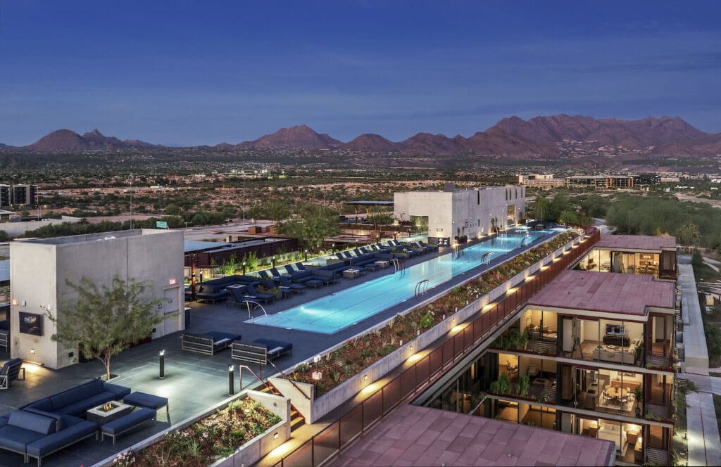 Featuring Optima’s signature cascading vertical gardens, the six concrete-framed buildings were designed to emulate the surrounding desert through its color selection and the site’s varied elevations are intended to mimic the shape of the McDowell Mountains in the distance.