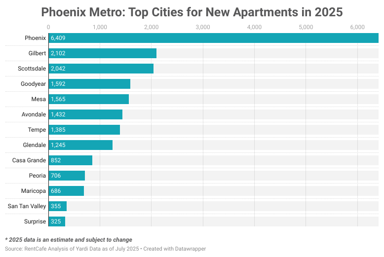 - The Phoenix metro area is set to complete 21,188 new apartments in 2025. That’s 5,500 units behind the podium, but it’s still among the only four metros to build more than 20,000 units in a year.