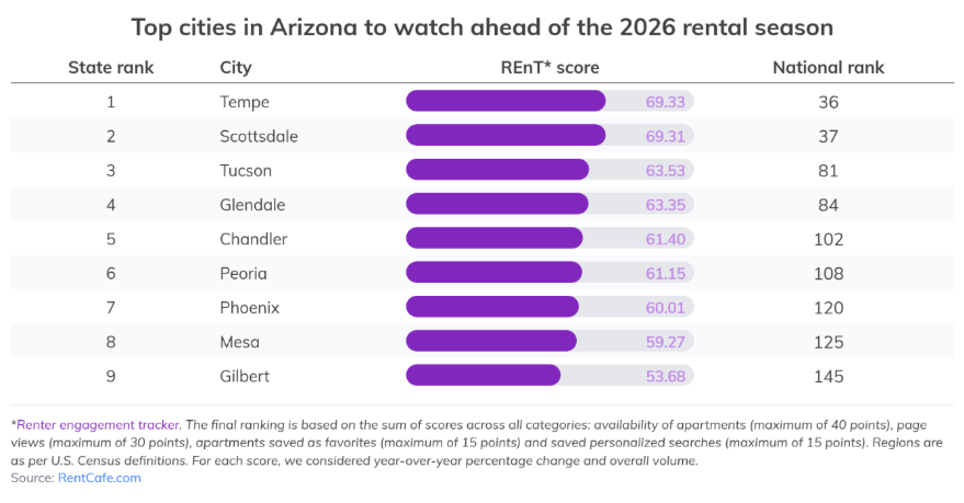 Overall, Arizona is seeing a statewide lift in online engagement, with Tempe and Scottsdale emerging as the top cities to watch ahead of the 2026 rental market.