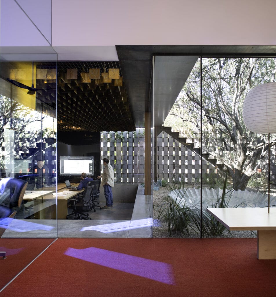 For example, at the Jones Studio office, a six-foot strip of garden space lines the north side of the building that opens up into the parking area. Farling says that at certain times of the day, the sun reflects off the plants and cacti causing green light to pour indoors.